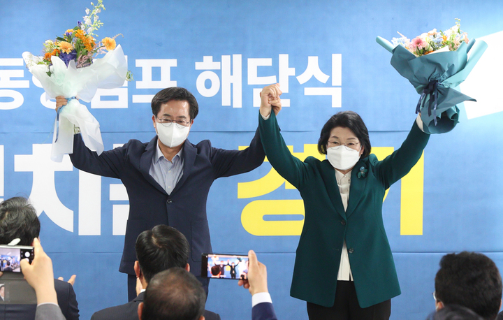 [수원=뉴시스] 김종택기자 = 김동연 경기도지사 당선인이 3일 오전 경기도 수원시 팔달구 선거사무소에서 열린 캠프 해단식에서 부인 정우영씨와 손을 높이 들고 있다.(사진=김동연 경기도지사 당선인 측 제공) 2022.06.03. [email protected] *재판매 및 DB 금지