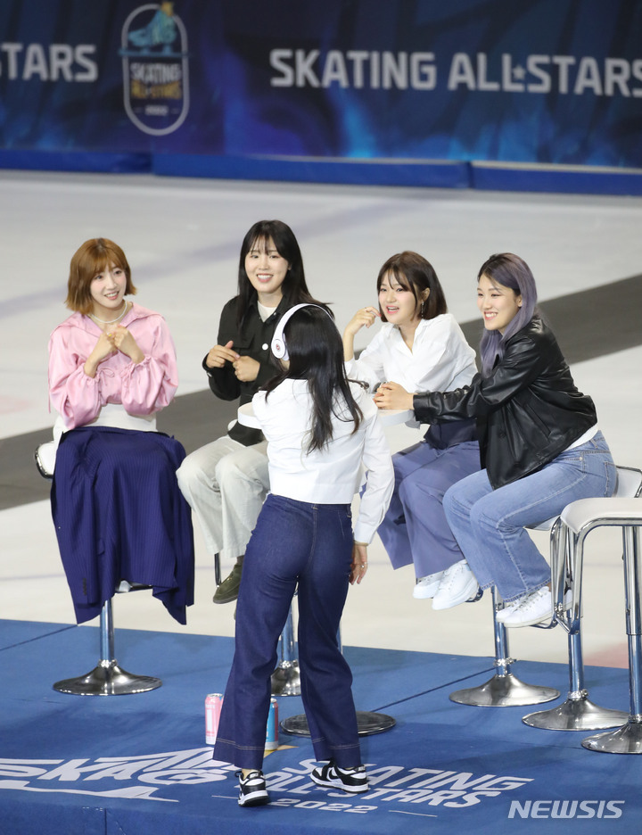 [서울=뉴시스] 권창회 기자 = 쇼트트랙 선수 이유빈을 비롯한 선수들이 5일 오후 서울 양천구 목동 아이스링크장에서 열린 스케이팅 올스타 2022에서 게임을 하고 있다. 2022.06.05. [email protected]