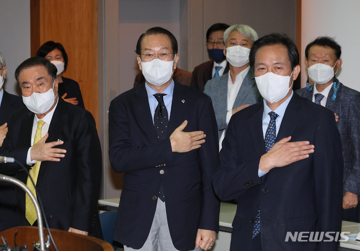 [서울=뉴시스] 국회사진기자단 = 더불어민주당 우상호 비상대책위원장이 15일 오후 서울 마포구 연세대학교 김대중도서관 컨벤션홀에서 열린 6.15 남북정상회담 22주년 기념식 및 학술회의에서 국기에 경례하고 있다. 앞줄 왼쪽부터 문희상 전 국회의장, 권영세 통일부 장관, 우상호 비대위원장. 2022.06.15. [email protected]