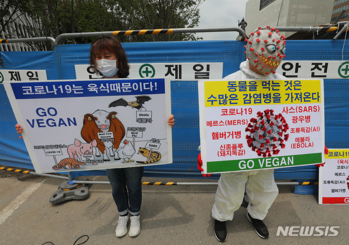 [서울=뉴시스] 배훈식 기자 = 한국채식연합 회원들이 20일 오후 서울 종로구 세종대로사거리에서 감염병 예방을 위한 채식을 촉구하고 있다. 2022.06.20. [email protected]