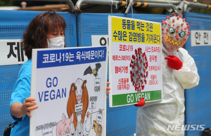 [서울=뉴시스] 배훈식 기자 = 한국채식연합 회원들이 20일 오후 서울 종로구 세종대로사거리에서 감염병 예방을 위한 채식을 촉구하고 있다. 2022.06.20. [email protected]