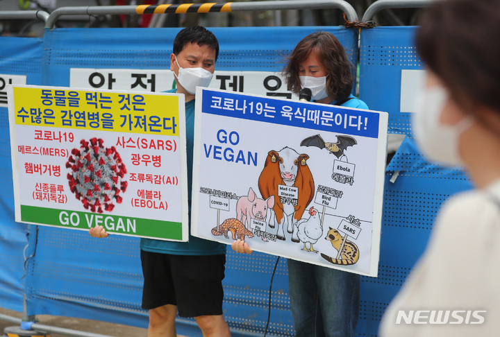 [서울=뉴시스] 배훈식 기자 = 한국채식연합 회원들이 20일 오후 서울 종로구 세종대로사거리에서 감염병 예방을 위한 채식을 촉구하고 있다. 2022.06.20. [email protected]