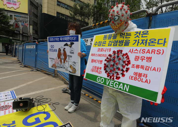 [서울=뉴시스] 배훈식 기자 = 한국채식연합 회원들이 20일 오후 서울 종로구 세종대로사거리에서 감염병 예방을 위한 채식을 촉구하고 있다. 2022.06.20. [email protected]