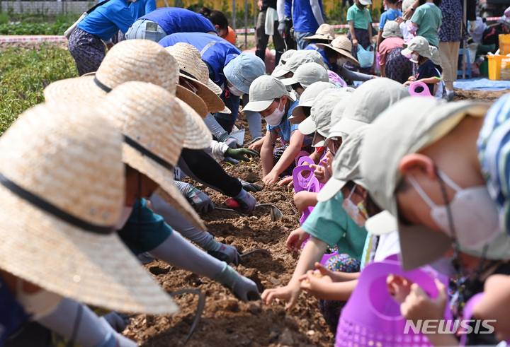[성남=뉴시스] 김종택기자 = 절기상 하지인 21일 경기도 성남시 중원구 성남시민농장을 찾은 어린이들이 감자캐기 체험을 하고 있다. 성남시는 코로나19 장기화로 야외 활동이 어려웠던 어린이와 청소년들에게 농부의 땀과 자연이 빚어낸 생명력을 알려주려고 이번 행사를 마련했다고 밝혔다. 2022.06.21. [email protected]