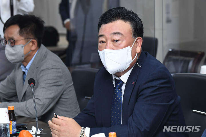 [안산=뉴시스] 국회사진기자단 = 설필수 반월표면처리사업협동조합 이사장이 28일 경기도 안산시 유일금속에서 더불어민주당 우상호 비상대책위원장 등이 참석한 ‘납품단가 연동제 도입 현장 간담회’에서 발언하고 있다. 2022.06.28. [email protected]