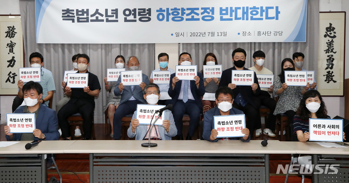 [서울=뉴시스] 조성우 기자 = 박만규 흥사단 이사장 등 각계 시민사회단체 대표자들이 13일 오전 서울 종로구 흥사단에서 열린 촉법소년 연령 하향 조정 반대 기자회견에서 피켓을 들고 구호를 외치고 있다. 2022.07.13. [email protected]