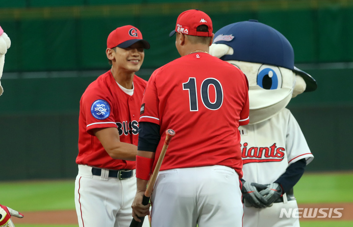 [부산=뉴시스] 하경민 기자 = 가수 비(정지훈)가 13일 부산 동래구 사직야구장에서 열린 롯데와 한화의 경기에 참석, 시구를 한 뒤 시타자로 나선 이대호 선수와 악수하고 있다. 2022.07.13. [email protected]