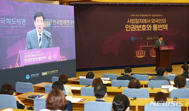 [서울=뉴시스] 김선웅 기자 = 김진표 국회의장이 14일 서울 여의도 국회 의원회관에서 열린 국회도서관-한국법제연구원 주최, '사법절차에서 외국인의 인권보호와 통번역' 공동국제세미나에서 격려사를 하고 있다. (공동취재사진) 2022.07.14. [email protected]