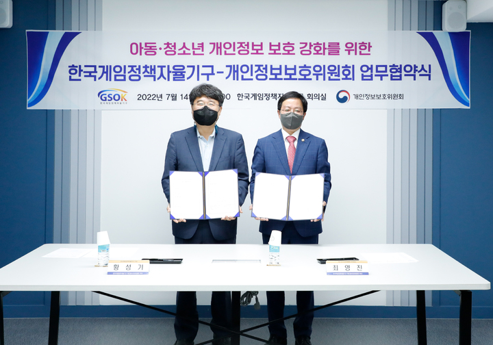 [서울=뉴시스] 조수정 기자 = 최영진(오른쪽) 개인정보보호위원회 부위원장과 황성기(왼쪽) 한국게임정책자율기구 의장이 14일 오후 한국게임정책자율기구에서 개최된 업무협약식에서 아동·청소년의 개인정보 보호 강화를 위한 업무협약서에 서명한 뒤 기념촬영 하고 있다. (사진=개인정보보호위원회 제공) 2022.07.14. [email protected]