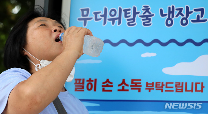 [서울=뉴시스] 추상철 기자 = 폭염에 시원한 생수를 무료로 제공하는 '무더위 탈출 냉장고' 운영이 시작된 18일 오후 서울 도봉구 중랑천변 산책로에서 시민이 시원한 생수를 마시고 있다. 2022.07.18. [email protected]