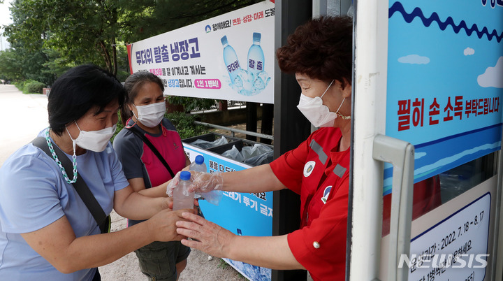 [서울=뉴시스] 추상철 기자 = 폭염에 시원한 생수를 무료로 제공하는 '무더위 탈출 냉장고' 운영이 시작된 18일 오후 서울 도봉구 중랑천변 산책로에서 시민이 생수를 받아들고 있다. 2022.07.18. [email protected]
