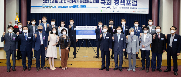 [서울=뉴시스] 유제철(오른쪽 뒷줄 다섯번째) 환경부 차관이 18일 서울 영등포구 국회의원 회관에서 열린 2022년도 한국지속가능캠퍼스협회 국회 정책포럼에 참석해 기념촬영을 하고 있다. (사진=환경부 제공) 2022.07.18. [email protected]