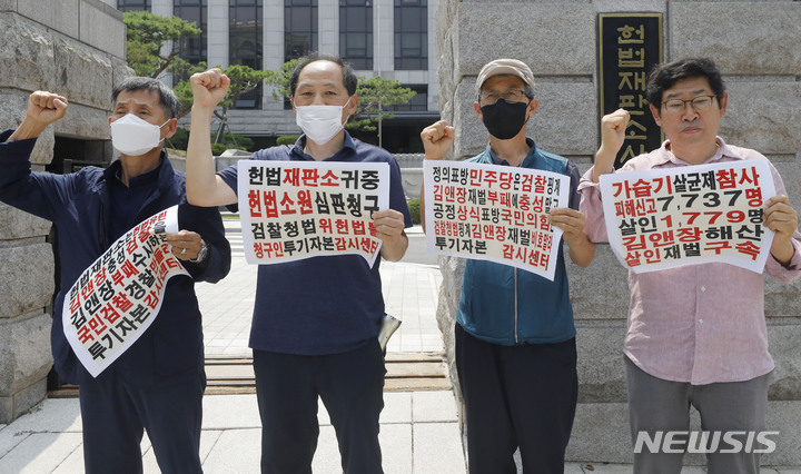 [서울=뉴시스] 최동준 기자 = 투기자본감시센터가 19일 서울 종로구 헌법재판소 앞에서 검찰청법 재판권 침해 위헌 등 헌법소원 심판청구 기자회견을 하고 있다. 2022.07.19. [email protected]