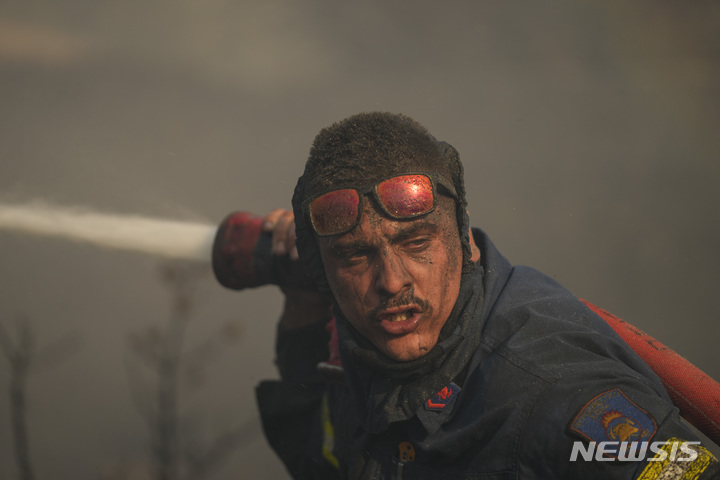 [아테네=AP/뉴시스] 19일(현지시간) 그리스 아테네 인근 펜텔리산에서 화재가 발생해 한 소방관이 불을 끄고 있다. 산불이 강풍으로 번지면서 인근 주민 수백 명에게 대피령이 내려졌으며 소방 당국은 화재 진압을 위해 11대의 소방 항공기와 5대의 소방 헬기를 투입했다고 밝혔다. 2022.07.20.