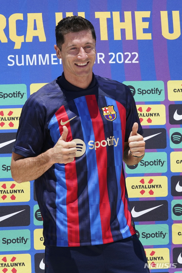 [포트 로더데일=AP/뉴시스] 로베르트 레반도프스키가 20일(현지시간) 미 플로리다주 포트 로더데일에서 FC 바르셀로나 유니폼을 입고 인사하고 있다. 레반도프스키는 바이에른 뮌헨(독일)에서 FC 바르셀로나(스페인)로 이적하면서 바로 팀의 미국 투어에 합류했다. 2022.07.21.