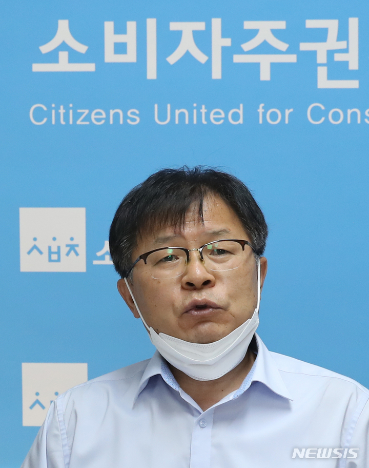 [서울=뉴시스] 김금보 기자 = 박순장 소비자주권시민회의 사무처장이 21일 오전 서울 종로구 소비자주권시민회의 회의실에서 '구글·애플 공정거래법 위반 및 애플 표시광고법 위반 공정거래위원회 신고서 제출' 기자회견을 하고 있다. 2022.07.21. [email protected]