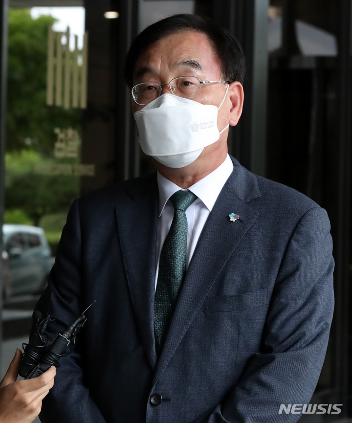 [서울=뉴시스] 추상철 기자 = 이재원 한반도 인권과 통일을 위한 변호사모임(한변) 회장이 21일 오후 서울 서초구 서울중앙지방검찰청에서 '문재인 전 대통령 고발 사건'과 관련 고발인 보충조사를 받기 전 취재진의 질문에 답변하고 있다. 2022.07.21. [email protected]