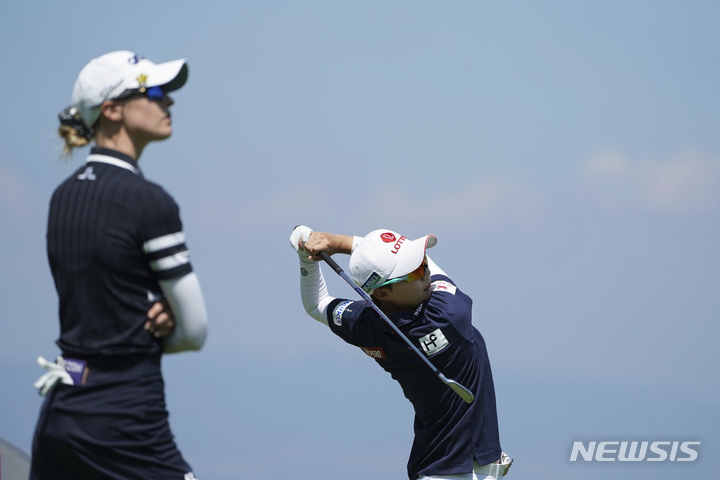 [에비앙레뱅=AP/뉴시스] 김효주가 24일(현지시간) 프랑스 에비앙레뱅의 에비앙리조트 골프클럽에서 열린 미국여자프로골프(LPGA) 투어 에비앙 챔피언십 최종라운드 5번 홀에서 티샷하고 있다. 김효주는 최종 합계 15언더파 269타 공동 3위로 대회를 마쳤다. 2022.07.25.