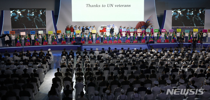 [서울=뉴시스] 조수정 기자 = 27일 오전 서울 중구 동대문디자인플라자(DDP)에서 열린 '6·25 전쟁 유엔군 참전의 날' 기념식에서 리틀엔젤스가 각 참전국에 감사의 마음을 전하는 팻말과 청사초롱을 들고 공연하고 있다. 2022.07.27. [email protected]
