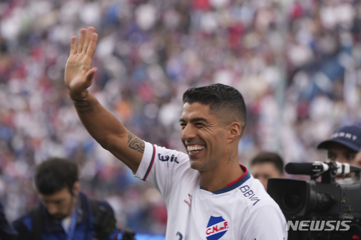 [몬테비데오=AP/뉴시스] 우루과이 축구 스타 루이스 수아레스가 7월 31일(현지시간) 몬테비데오의 그란파르케 경기장에 도착해 환영하는 팬들을 향해 인사하고 있다. 수아레스는 아틀레티코 마드리드(스페인)와의 계약 만료 후 본인의 첫 프로 경력을 시작한 나시오날로 이적했다. 2022.08.01.