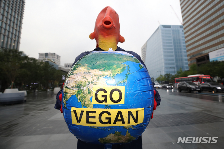 [서울=뉴시스] 조성우 기자 = 이원복 한국채식연합 대표가 25일 오후 서울 종로구 광화문광장에서 채식을 촉구하는 퍼포먼스를 하고 있다. 2022.08.25. [email protected]
