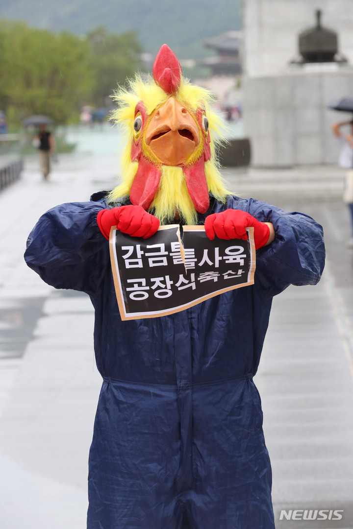 [서울=뉴시스] 배훈식 기자 = 이원복 한국채식연합 대표가 29일 오후 서울 종로구 광화문광장에서 감금틀 사육, 공장식 축산 중단! 채식 촉구 퍼포먼스를 하고 있다. 2022.08.29. [email protected]