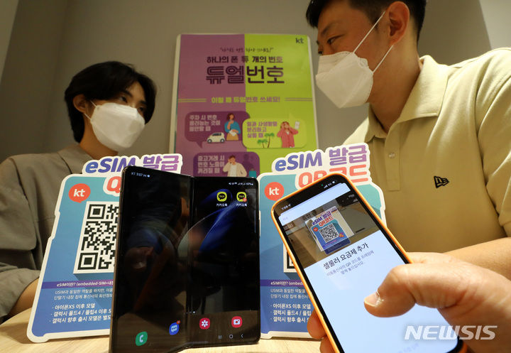 [서울=뉴시스] 이영환 기자 = 31일 서울 종로구 KT플라자 광화문역점에서 한 시민이 e심 활용 요금제인 KT의 듀얼번호에 대한 설명을 듣고 있다. 스마트폰에 유심칩을 직접 꽂지 않고 인터넷으로 내려받을 수 있는 e심 서비스가 1일 시행된다. 유심과 e심을 동시에 이용하면 하나의 스마트폰에서 두 개의 전화번호를 개통할 수 있다. 다만 1개 단말 내에 한 사람의 명의로만 이용 가능하다. 대포폰 등 이동전화 부정사용 방지를 위한 조치다. 2022.08.31. [email protected]