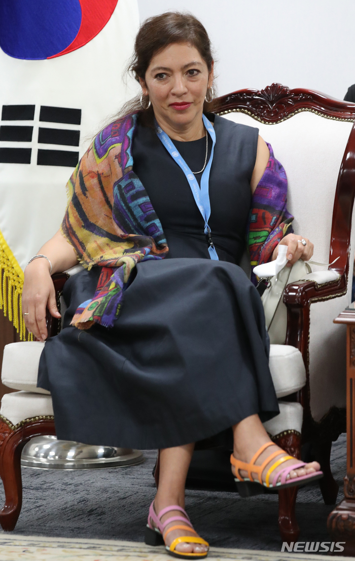 [서울=뉴시스] 김명원 기자 = 엘리자베스 살몬 유엔 북한인권 특별보고관이 2일 오전 서울 종로구 정부서울청사 통일부 집무실에서 권영세 통일부 장관 접견을 하고 있다. 2022.09.02. [email protected]