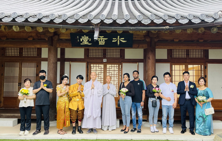 [서울=뉴시스] 조수정 기자 = 사단법인 꿈을이루는사람들(대표 진오 스님)은 지난 18일 오후 구미외국인주민센터 잔디마당에서 제7회 외국인노동자 합동결혼식을 개최했다. 이날 외국인노동자 동거부부 5개 나라(캄보디아, 스리랑카, 중국, 베트남, 태국) 출신 5쌍이 결혼식을 올렸다. 고향을 떠나 타국에서 부부의 연을 맺어 생활하는 외국인노동자 부부들이 결혼식을 통해 심리적 안정감 향상과 행복한 삶과 한국에서 안정적인 생활을 유지하고, 다양한 문화교류의 장을 만들기 위해 결혼식을 준비했다고 전했다. (사진=꿈을이루는사람들 제공) 2022.09.19. [email protected] *재판매 및 DB 금지