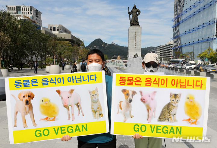 [서울=뉴시스] 배훈식 기자 = 한국채식연합 회원들이 26일 오후 서울 종로구 세종대로사거리에서 국제 비폭력의 날 맞이 평화 채식 촉구 기자회견을 하고 있다. 2022.09.26. [email protected]