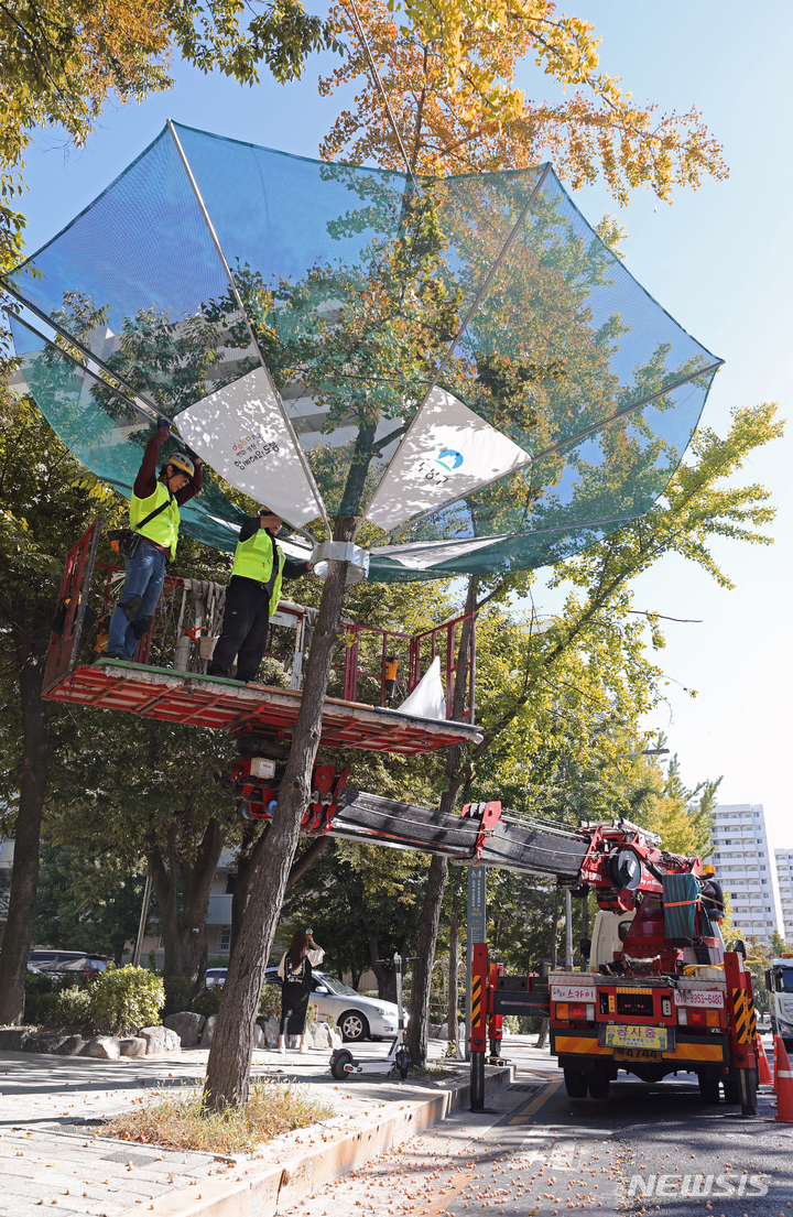 [서울=뉴시스] 김금보 기자 = 작업자들이 27일 오후 서울 도봉구 노해로70길 일대에서 은행나무 열매 수거 장치를 설치하고 있다. 은행 열매가 떨어지는 시기가 다가오면서 서울시 자치구마다 은행 열매 제거 작업에 나서고 있다. 2022.09.27. [email protected]