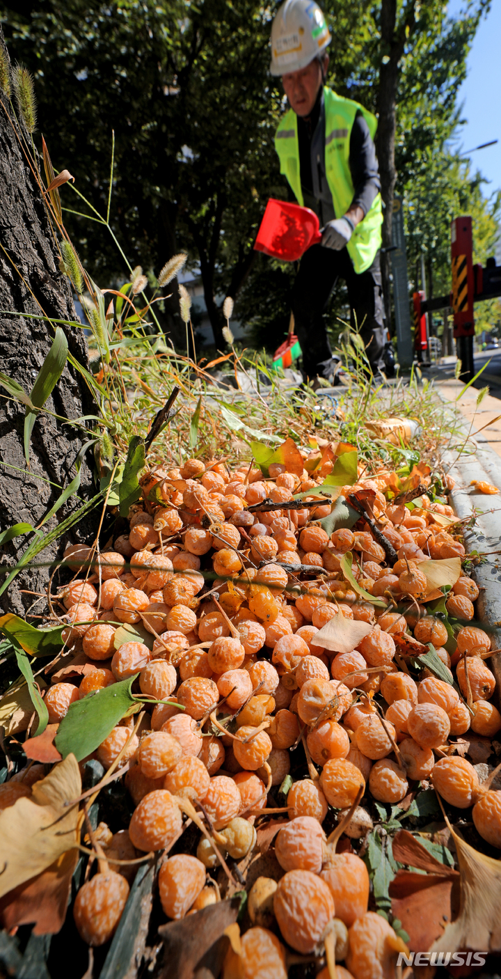 [서울=뉴시스] 김금보 기자 = 작업자가 27일 오후 서울 도봉구 노해로70길 일대에서 땅에 떨어진 은행나무 열매를 청소하고 있다. 은행 열매가 떨어지는 시기가 다가오면서 서울시 자치구마다 은행 열매 제거 작업에 나서고 있다. 2022.09.27. [email protected]