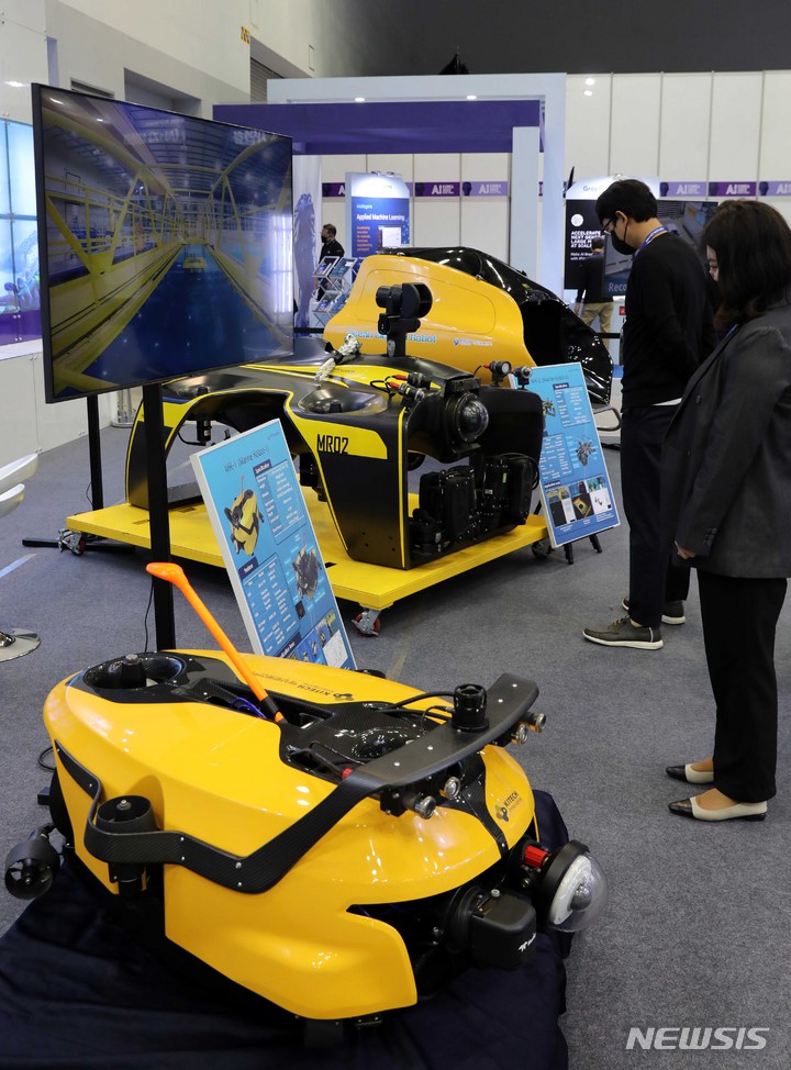 [부산=뉴시스] 하경민 기자 = 'K-ICT Week in BUSAN 2022'가 개막한 28일 부산 해운대구 벡스코 제2전시장을 찾은 관람객들이 해저 탐사를 할 수 있는 다양한 해양로봇을 둘러보고 있다. AI KOREA, IT 엑스포 부산, 클라우드 엑스포 등 3개 전시가 동시에 열리는 이번 행사에는 관련 업체 250곳이 참가해 인공지능, 메타버스, 클라우드 등 최신 디지털 신산업의 최신기술을 소개한다. 행사는 30일까지 계속된다. 2022.09.28. [email protected]