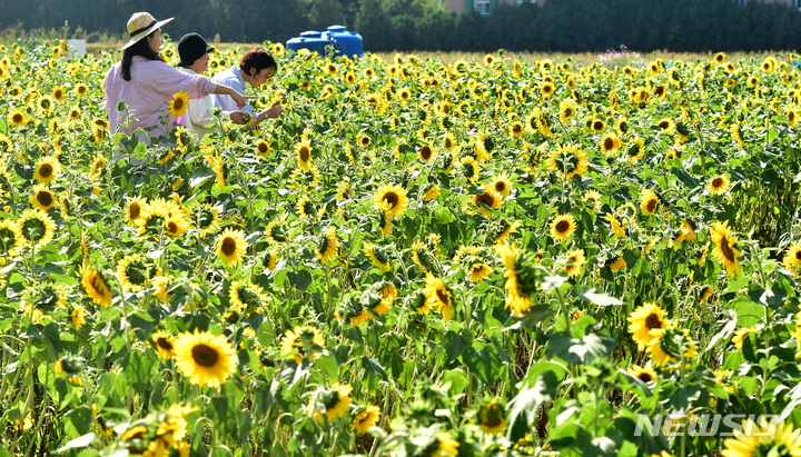[대구=뉴시스] 이무열 기자 = '제10회 대구도시농업박람회' 개막을 앞둔 29일 오후 대구 수성구 대구농업마이스터고등학교에서 시민들이 활짝 핀 해바라기 정원을 둘러보고 있다. 2022.09.29. [email protected]