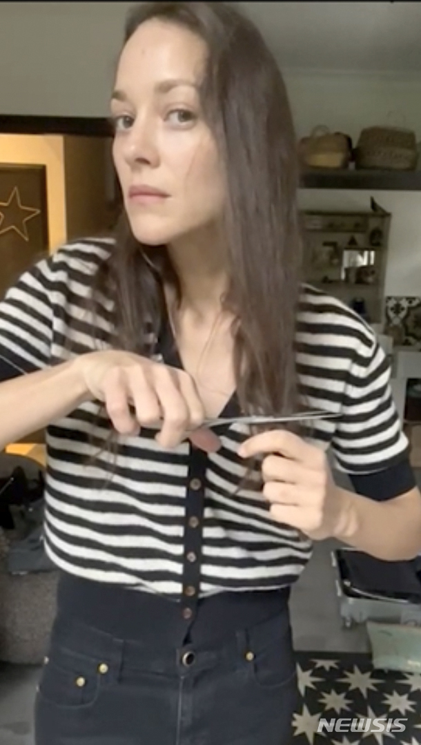 [파리=AP/뉴시스] 날짜가 밝혀지지 않은 영상 캡처 사진에 프랑스 배우 마리옹 꼬띠아르가 이란 여성의 '히잡' 시위에 연대해 자신의 머리카락을 자르고 있다. 2022.10.06.