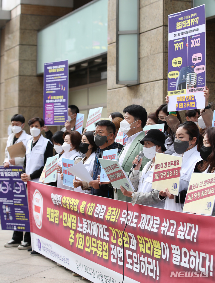 [서울=뉴시스] 김진아 기자 = 백화점면세점판매서비스노동조합 조합원들이 6일 서울 중구 롯데백화점 본점 앞에서 열린 '백화점·면세점 노동자에게도 의무휴업 제도가 필요하다, 주 1회 의무휴업 전면 도입하라' 기자회견에서 구호를 외치고 있다. 2022.10.06. [email protected]