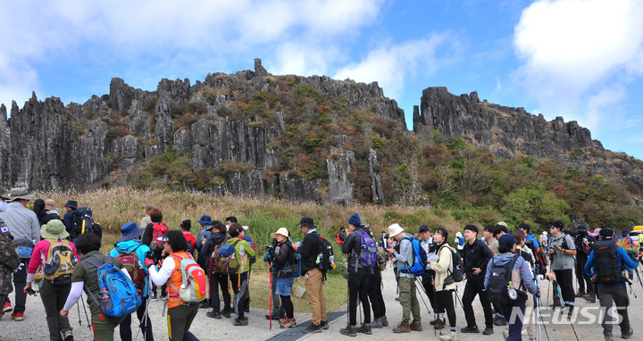 [광주=뉴시스] 이영주 기자 = 무등산국립공원 정상 개방 행사가 열린 8일 오전 광주 무등산국립공원 지왕봉 앞에서 탐방객들이 기념 촬영을 하기 위해 줄을 서고 있다. 2022.10.08. [email protected]