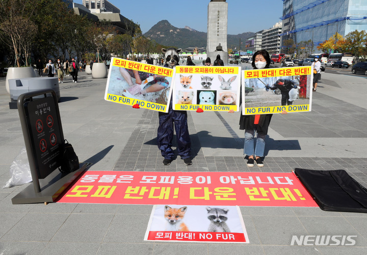 [서울=뉴시스] 배훈식 기자 = 한국동물보호연합 회원들이 20일 오후 서울 종로구 세종대로사거리에서 모피, 다운 반대 퍼포먼스를 하고 있다. 2022.10.20. [email protected]