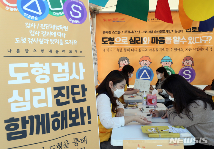 [서울=뉴시스] 김금보 기자 = 25일 서울 송파구 올림픽공원 평화의 광장에서 열린 '2022 송파 교육박람회'를 찾은 청소년들이 도형검사 심리진단 체험을 하고 있다. 2022.10.25. [email protected]