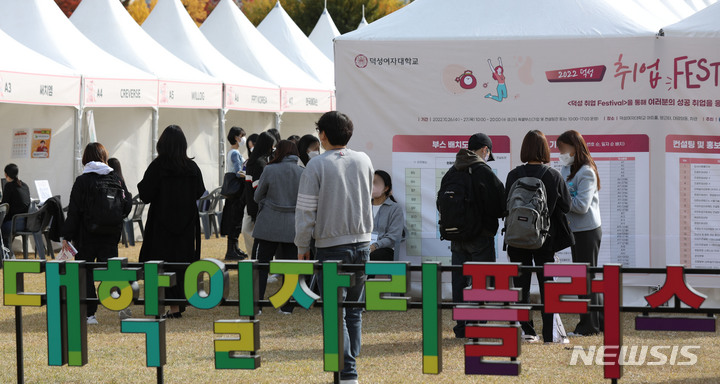 [서울=뉴시스] 조수정 기자 = 26일 서울 도봉구 덕성여자대학교에서 개막한 '2022 덕성 취업페스티벌'에서 재학생과 졸업생 등이 기업 채용, 이미지컨설팅 등 상담을 받고 있다. 덕성여자대학교 대학일자리본부 진로취업센터는 서울북부고용센터, 주한외국인기업연합회와 함께 27일까지 교내 아트홀, 영근터, 대강의동 등에서 취업페스티벌을 진행한다. 재학생과 졸업생 뿐 아니라 지역 청년도 상담받을 수 있다. 2022.10.26. [email protected]