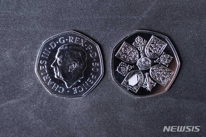 [폰티클룬=AP/뉴시스] 27일(현지시간 ) 영국 웨일스 폰티클룬의 왕립 조폐국에서 찰스 3세 국왕의 얼굴이 그려진 주화가 공개되고 있다. 찰스 3세 국왕의 즉위를 기념해 신규로 발행된 5파운드와 50펜스 동전은 12월 28일부터 유통된다. 2022.10.28.
