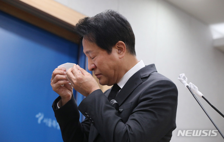 [서울=뉴시스] 추상철 기자 = 오세훈 서울시장이 1일 오후 서울 중구 서울시청 브리핑룸에서 '이태원 사고'관련 입장발표를 하며 눈물을 흘리고 있다. 2022.11.01. [email protected]