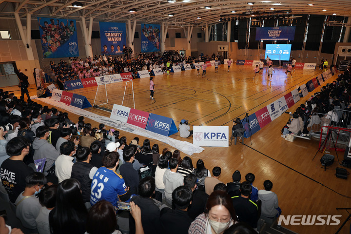 [서울=뉴시스] 백동현 기자 = 6일 오후 서울 서대문구 명지전문대학교 실내체육관에서 제1회 한국프로축구선수협회 자선 축구대회가 열리고 있다. 2022.11.06. [email protected]