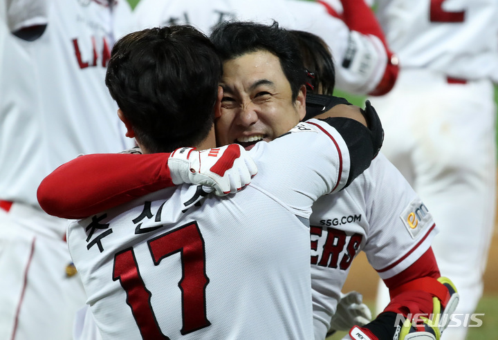 [인천=뉴시스] 이영환 기자 = 7일 인천 SSG랜더스필드에서 열린 2022 KBO 한국시리즈 5차전 키움 히어로즈와 SSG 랜더스의 경기, 9회말 무사 1,3루에서 SSG 김강민이 끝내기 스리런 홈런을 날린 후 추신수와 기뻐하고 있다. 2022.11.07. [email protected]