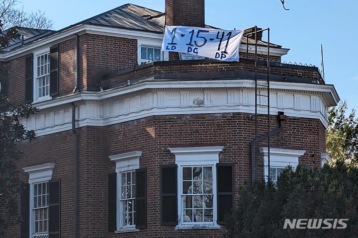 [샬러츠빌=AP/뉴시스] 14일(현지시간) 미 버지니아주 샬러츠빌의 버지니아대학 구내에서 총격이 발생해 주변 건물에 숨진 미식축구 선수들의 등 번호가 쓰인 현수막이 걸려 있다. 이 총격으로 이 대학 미식축구 선수 3명이 숨지고 2명이 다쳤으며 범인은 체포됐다. 2022.11.15.