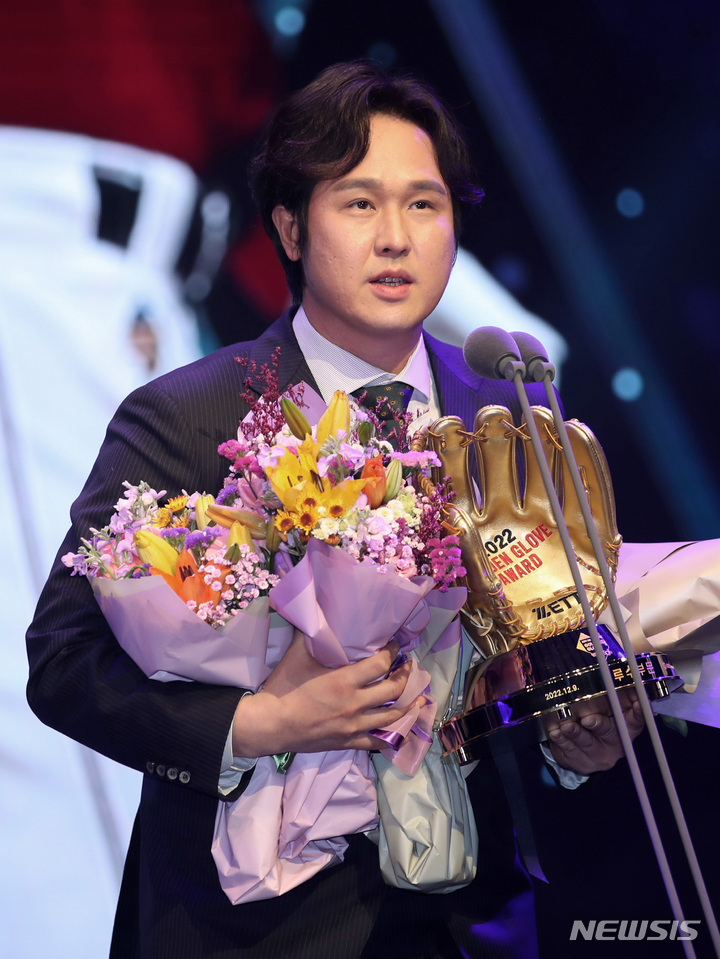 [서울=뉴시스] 김진아 기자 = 9일 서울 강남구 코엑스 오디토리움에서 열린 2022 신한은행 SOL KBO 골든글러브 시상식에서 SSG 랜더스 최정이 3루수 부문 골든글러브를 수상, 소감을 말하고 있다. 2022.12.09. [email protected]