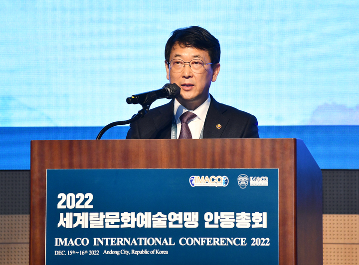 [서울=뉴시스] 최응천 문화재청장이 15일 안동시 안동국제컨벤션센터에서 '한국의 탈춤'의 유네스코 인류무형문화유산 대표목록 등재를 기념해 열린 '2022 세계탈문화예술연맹 안동총회'에서 축사를 하고 있다. (사진=문화재청 제공) 2022.12.15. [email protected] *재판매 및 DB 금지