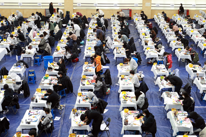 [서울=뉴시스] 김근수 기자 = 8일 서울 노원구 삼육대학교 체육관 주경기장에서 열린 2023학년도 정시모집 아트앤디자인학과 미술 실기고사에서 수험생들이 실기고사를 치르고 있다. (사진= 삼육대 제공) 2023.01.08. [email protected] *재판매 및 DB 금지