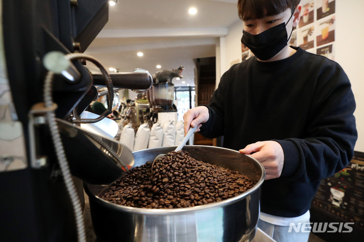 [서울=뉴시스] 백동현 기자 = 9일 오전 서울 서초구 고품격커피공장 본점에서 직원이 로스팅된 커피원두 쿨링 작업을 하고 있다. 최근 환율 안정화와 할당관세 인하 효과로 커피원두(생두) 수입가격이 안정세를 찾고 있다. 농식품부에 따르면 지난해 12월 기준 커피 생두 수입가격은 1㎏에 6058원으로 두 달 전인 10월(7401원) 대비 18.1% 하락했다. 국제 원두가격이 수입가격에 반영되는데 통상 2~3개월이 소요되는 것을 감안하면 1분기 이후 가격 하락세가 더욱 확대될 것으로 전망된다. 2023.01.09. [email protected]