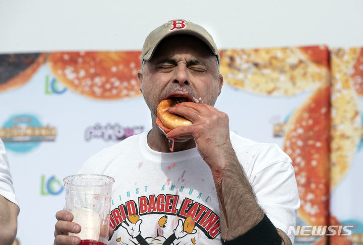 [라스베이거스=AP/뉴시스] 15일(현지시간) 미 네바다주 라스베이거스에서 베이글의 날을 맞아 베이글 먹기 대회가 열려 제프리 에스퍼가 커피와 함께 베이글을 먹고 있다. 에스퍼는 8분 동안 베이글 17개¾을 먹어 14개¾을 먹은 닉 웨리를 꺾고 우승, 7500달러의 상금을 챙겼다. 2023.01.16.